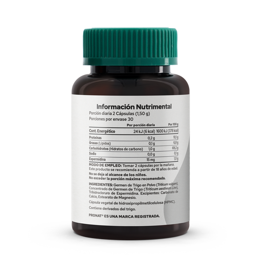PronatCon Germen de Trigo y Concentrado de Germen de Trigo – Aporta Espermidina – Cápsula Vegetal Cada envase contiene 60 cápsulas de 750 mg, con una por...